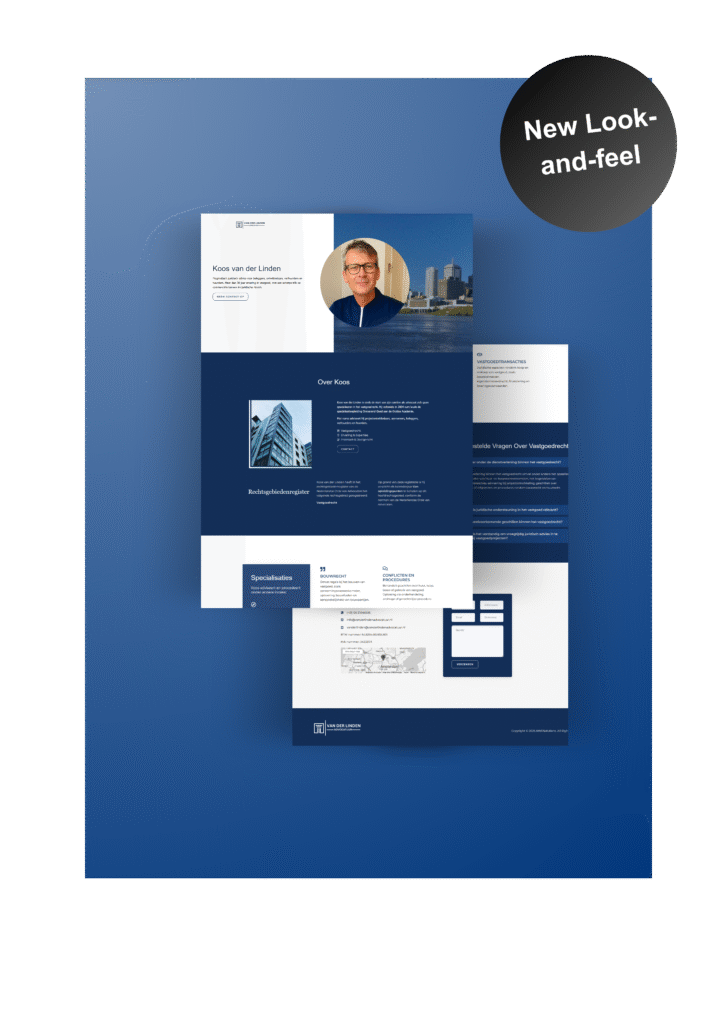 Voor Van der Linden Advocatuur ontwikkelden we een digitale identiteit die professionaliteit en vertrouwen uitstraalt. Naast de branding – een chic logo met vastgoed-symboliek en de naam “Van der Linden Advocatuur” – ontwierpen we een elegante one page website. Met een strak navyblauw-wit thema en een professionele portretfoto in de openingssectie krijgt de website meteen de juiste uitstraling.